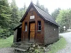 Der Rechteckbau mit Satteldach besitzt seitlich einen Anbau, der als Schutzhütte genutzt werden kann.[2]