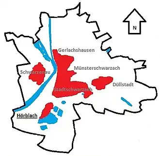![]() Lage von Hörblach (fett) innerhalb des Schwarzacher Gemeindegebietes