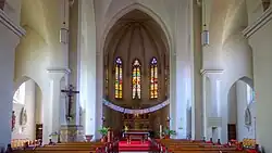 Das Kirchengebäude besitzt im Süden einen Fassadenturm und wird im Norden von einem Chor abgeschlossen. Dazwischen befindet sich das Langhaus mit einem Querschiff. An der Ostwand befindet sich eine Gedenktafel für Michael Denis mit einer von Vincenz Pilz geschaffenen Reliefbüste des Schriftstellers und an der Westwand das Epitaph der Fürstin Leopoldine von Liechtenstein.