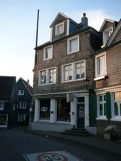 Das verschieferte Fachwerkgebäude aus dem späten 18. Jahrhundert ist zweigeschossig und mit einem Ladenlokal im Erdgeschoss versehen. Das Gebäude ist giebelständig, das heißt, der Giebel zeigt zur Straße hin. Das geschweifte Mansarddach ist mit einem Zwerchgiebel ausgestattet.