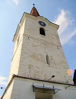 - Die evangelische Kirche[6] und deren Glockenturm im 13. Jahrhundert errichtet und im 15. erneuert, stehen nach Angaben des Verzeichnisses historischer Denkmäler des Ministeriums für Kultur und nationales Erbe (Ministerul Culturii și Patrimoniului Național) unter Denkmalschutz.[7] Das Portal und eine Nische der Kirche im romanischen Stil deuten ins Mittelalter.[3]