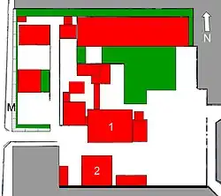 Weiter ist eine Steinpagode und im Westen eine Steinmauer (M im Plan) aus der Erbauungszeit erhalten.