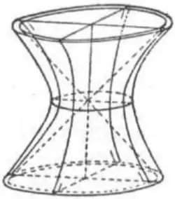 Die Form der doppeltgekrümmten HP-Schalen (Typ HPS, „S“ evtl. für „Steg“)[3] generiert sich aus einem Segment eines einschaligen Hyperboloids.[4][3][5] Diese entstehen durch Rotation einer Hyperbel um ihre Nebenachse beziehungsweise durch Rotation einer Geraden um eine zu ihr windschiefen Geraden (Achse), (Bilder dazu unter Rotationshyperboloid). Hierin liegt ein großer Vorteil dieser Form, da man so trotz ihrer doppelten Krümmung mit geraden Bewehrungsstäben arbeiten kann und diese sogar vorgespannt werden können (Spannbeton).