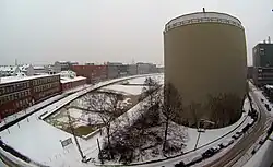 Auf diese Freifläche folgt ein Gefahrgutlager der Firma Lehnkering. Das war ein Grund dafür, warum die Südseite bisher nicht weiter erschlossen wurde. Im Umkreis von 500 Meter ist beispielsweise Wohnbebauung nicht genehmigungsfähig – dies betrifft auch das Gelände der Osmo-Hallen auf der Nordseite.[25] Der Pachtvertrag Lehnkerings lief bis 2017. Auch das etwas zurückgelegene GuD-Kraftwerk macht aber Wohnbebauung auf der Südseite selbst auf lange Sicht unwahrscheinlich.