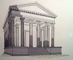 Das aufgehende Mauerwerk des Tempels selbst war bei den Ausgrabungen nicht mehr vorhanden, ließ sich aber rekonstruieren, da die unterste Steinreihe Abdrücke auf dem Gussmauerwerk des Fundaments hinterlassen hat. Diese Abdrücke bilden zwei Rechtecke, von denen das eine innerhalb des anderen liegt. Beim inneren Mauerzug handelt es sich um den geschlossenen Raum in der Mitte des Tempels (die Cella), dessen Mauern eine Stärke von 1,65 Metern aufwiesen. Das äußere Steingeviert ist an den beiden Längsseiten und der nördlichen Schmalseite 3,25 – 3,40 m mächtig, an der südlichen (Eingangs-)Schmalseite des Tempels nur 2,85 m. Es bildete die Basis für die Säulenreihe (Peristasis), die den Innenbau auf allen vier Seiten umgab – auf den Schmalseiten mit je sechs Säulen, auf den Längsseiten wohl mit jeweils neun Säulen. Auf drei Seiten des Tempels standen die Säulen fast ganz am Rand des Fundamentes, lediglich auf der Südseite ragte dieses noch etwa fünf Meter darüber hinaus. Dadurch entstand dort eine Art Vorterrasse des Tempels, in die eine Treppe eingelassen war, die das Betreten des Gebäudes ermöglichte. Die Höhe des Gesamtbauwerkes wird mit 26,80 m rekonstruiert.