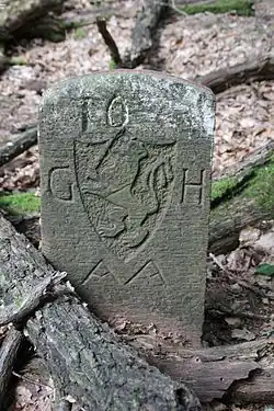 Über den Hahnenkamm verläuft eine Reihe historischer Grenzsteine aus dem Jahr 1810. Sie trennten die Gebiete zweier früherer Staaten im Rheinbund. Auf der westlichen Seite lag das Territorium des Großherzogtums Hessen, dem das Amt Alzenau in der Provinz Starkenburg angehörte. Auf der östlichen Seite befand sich das Großherzogtum Frankfurt mit der Pfarrei Mömbris im Departement Aschaffenburg. Alle diese Grenzsteine sind durchnummeriert. Die Linie verläuft durch das Tal des Elmertsbachs bis nach Rückersbach, über den Rabengrundkopf und die Stempelhöhe, vorbei an Hohl und Angelsberg, nach Großhemsbach. Danach zog sich die Grenze an Kleinhemsbach vorbei und über die Daunert ins Tal des Hemsbaches bei Brücken. Die Grenzsteinreihe läuft weiter durch das Gebiet des Steinbruches und über die Gipfel von Hoher Mark und Giftiger Berg ins Kahltal zur Gemeindekläranlage. Die Grenzsteine sind großteils noch gut erhalten, aber im Bereich von Äcker und Wiesen sowie des Steinbruches nicht mehr vorhanden.