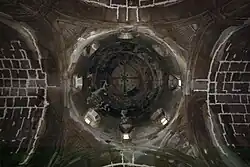 Der beinahe quadratische Betsaal der dreischiffigen Pfeilerbasilika aus gelblich-grauen Sandsteinquadern wird von Tonnengewölben überdeckt, die von zwei Pfeilerpaaren gestützt werden. Die Pfeiler sind im Mittelschiff durch Gurtbögen miteinander verbunden, die jedoch an den Gewölben über den besonders schmalen Seitenschiffen nicht weitergeführt werden. Die 25 Meter hohe Kreuzkuppel stützt sich im Osten auf die Seitenwände der Apsis und im Westen auf zwei freistehende Pfeiler. Sie wird durch einen kreisrunden Tambour weit nach oben gezogen und schließt außen mit einem Kegeldach ab. Der Tambour wird an der Außenseite durch halbrunde Blendbögen über schlanken Doppelsäulen gegliedert, jede zweite Wandnische enthält ein hohes Fenster. Innen wird das Kuppelrund aus der quadratischen Grundfläche über Pendentifs an den Ecken gebildet. Die zentrale halbrunde Apsis an der Ostwand misst 6,95 Meter in der Breite und 5,75 Meter in der Tiefe. Sie ist fensterlos und wie der gesamte Innenraum dunkel, die beiden seitlichen Apsisnebenräume (Pastophorien) werden von je einem Fensterschlitz schwach erhellt.