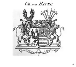 - Die Grafen von Hacke führten trotz ihrer Zugehörigkeit zu den märkischen Hake seit ihrer Erhebung in den Grafenstand ein von diesen verschiedenes Wappen, ein der Länge nach gespaltenes Schild: Die rechte silberne Hälfte stellt einen halben schwarzen preußischen Adler vor, doch so, dass die Brust und der gekrönte Kopf sichtbar bleibt, die linke Hälfte ist oben rot, unten Silber. In der oberen roten Hälfte steht ein goldener, nach der rechten Seite aufspringender Löwe, der untere Teil ist von zwei blauen Balken durchzogen, von denen der obere mit drei, der untere mit zwei silbernen Kugeln belegt ist. Auf dem Schilde ruht zwischen zwei Helmen eine goldene Krone. Der rechte Helm trägt zwei gegeneinander sich wendende schwarze Adlerflügel, die mit goldenen Kleestängeln belegt sind, der zur Linken aber ein rot und goldenes Polster mit sechs roten Fähnlein, deren drei nach der rechten, und drei nach der linken Seite flattern. Die Stangen sind rot und golden. Die Helmdecken rechts silbern und schwarz, links rot, golden und blau. Zu Schildhaltern sind zwei goldene Löwen gewählt. (Auszug aus dem Grafenpatent.)[7]