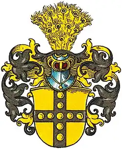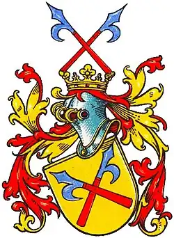 Blasonierung des Stammwappens: In Silber drei rote Haken. Auf dem rot-silbern bewulsteten Helm ein silbernes Kreuz mit fünf oder mehr goldenen Kugeln.[13]