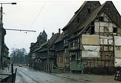 So wurde Halberstadt Teil der SBZ und ab 1949 der DDR. Von 1949 bis 1989 wurde die zu großen Teilen zerstörte Innenstadt teilweise neu und in „sozialistischem Bauverständnis“ wiederaufgebaut; der noch erhaltene Bestand an Fachwerkhäusern in der Altstadt wurde geplant dem Verfall preisgegeben und 600 davon großflächig abgerissen. Auch die Ruine der romanisch-gotischen Paulskirche wurde beseitigt. Zur Wende 1989 existierten nur noch kleine Teile der Altstadt mit 447 Häusern. „Fachwerkhäuser, die im Privatbesitz waren, konnten wegen der staatlich reglementierten geringen Mieten nicht instand gehalten werden. Aber auch die Stadt kümmerte sich nicht mehr um Fachwerkhäuser, die ihr gehörten. Gezielte ‚Entmietung‘ wurde betrieben.“ (Rolf Heydecke)[23]