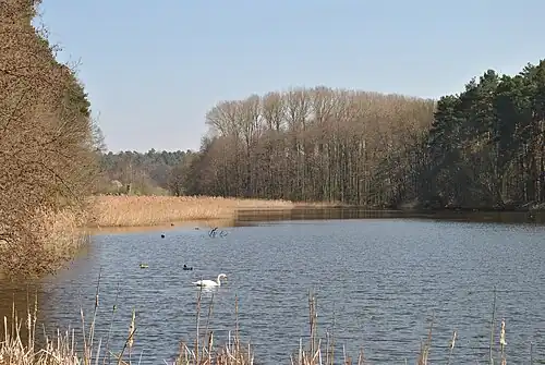 Im Seichtwasser ist das Gewöhnliche Pfeilkraut (Sagittaria sagittifolia) zu finden, während um den See Gräser der Gattung Poa und die Geflügelte Braunwurz (Scrophularia umbrosa) wachsen. Begleitet werden die Pflanzen vom Gewöhnlichen Blutweiderich (Lythrum salicaria), vom Froschbiss (Hydrocharis morsus-ranae), vom Rauen Hornblatt (Ceratophyllum demersum), von der Gelben Teichrose (Nuphar lutea), von der Kleinen Wasserlinse (Lemna minor), vom Bittersüßen Nachtschatten (Solanum dulcamara), von der Echten Zaunwinde (Calystagia sepium) und der Rossminze (Mentha longifolia).[4]