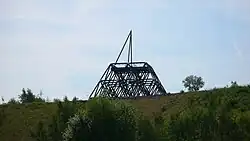 Auf der Nordseite zielt eine Straßenachse direkt auf den Turm, auf der Südseite führt eine Treppe, erstellt aus auf dem Gelände vorgefundenen Schienen, bis zum Haldentop.