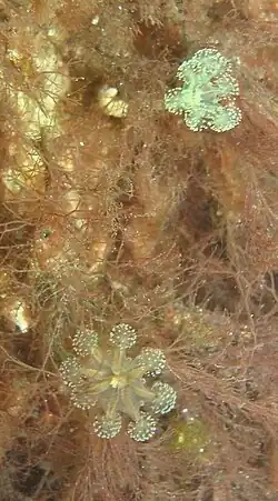 Die Becherqualle Haliclystus octoradiatus an Seegras (Exemplar mit einem zusätzlichen Büschel von Nesselkapseln) | ||||||||||||