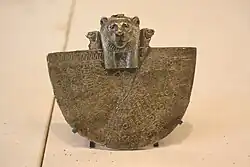 Weiterhin gab es ab dem Neuen Reich Halskragen als Amulette (modern mit dem griechischen Begriff Ägis bezeichnet), die den Kopf eines Gottes, eines heiligen Tieres oder des Königs tragen, wobei in dieser Form eher weibliche Gottheiten überwogen. Vereinzelt wurde auch ein Götterpaar gezeigt, z. B. Onuris und Tefnut vereinigt.[6] Die Kragen fanden sich aber nicht nur bei Mumien, sondern auch als Kettenglieder oder Besatzstücke von Finger- und Ohrringen.[7][8] Zudem existierten kleine Nachbildungen als Amulette für Tote.[9][10]