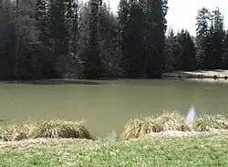 Durchfließt auf etwa 457 m ü. NHN einen See etwa hundert Meter südwestlich von „Hof“ hinter dem Damm der Straße von dort zum Vogelhöfle, 0,2 ha.