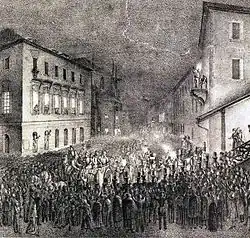 Die Konzentration der Bevölkerung auf das Ausland war nicht zuletzt der Pressezensur geschuldet, da die Berichterstattung über Innerstaatliches unterbunden wurde. Es vermehrte sich die ausführliche Berichterstattung über die Anrainerstaaten. Dies führte zu Interesse, Annäherung und Zustimmung für die Idee des französischen Liberalismus und entwickelte sich wie in Frankreich selbst immer weiter zur radikalen Ausprägung.[37] Die Neuwahlen des bayrischen Landtags im Dezember 1830 brachten den Liberalen Erfolge. In München begeisterten sich öffentlich die Studenten darüber. Die Freude ging in Unruhen über. Der bayrische König Ludwig I. nahm dies zum Anlass, die Universität zu schließen, Verhaftungen durchzuführen und am 28. Januar 1831 die Pressezensur zu verschärfen.[38][39] Darauf schafften die Oppositionellen in der Kammer diese Presseverordnung wieder ab.[38] Die immer noch gültigen freiheitlicheren Verfassungsrechte im rheinpfälzischen Gebiet veranlassten zu dieser Zeit zahlreiche Altbayern zur Übersiedlung.[39]