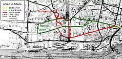 Durch die Verlagerung des Bahnhofes Altona nordwärts an seinen jetzigen Standort war der Weg frei für eine bessere Verbindung nach Ottensen. Diese Chance ließ sich die „Zentralbahn“ nicht entgehen und eröffnete neue Strecken nach Ottensen, die in komplizierter Schleifenfahrt und teilweise im Linksverkehr betrieben wurden. Sie folgten mit ihrer Gleislage dem Bebauungsplan der Stadt Altona für „das alte Bahnhofsterrain“ von 1895. Am 31. Oktober 1896 kamen diese Strecken in Betrieb[12].