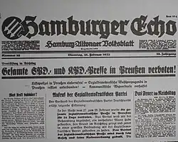 Unter der Herrschaft der Nationalsozialisten von 1933 bis 1945 war es verboten, nach dem Zweiten Weltkrieg erlebte es eine erneute Blüte und erreichte kurz nach der Währungsreform 1948 die höchste Auflage von 244.000 Exemplaren.[5] Ein politischer Redakteur der Nachkriegsjahre war Herbert Wehner. Kurz darauf brach die Auflage allerdings ein, nicht zuletzt durch die Konkurrenz des 1948 von Axel Springer gegründeten Hamburger Abendblatts und anderer Zeitungen.