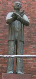 1979, die Plastik von Fritz Fleer steht an der Außenfassade der St. Petri-Kirche und stellt den 1945 hingerichteten Theologen Dietrich Bonhoeffer in Häftlingskleidung und mit gefesselten Händen dar. (Wegweiser zu den Gedenkstätten, Nr. 54) |