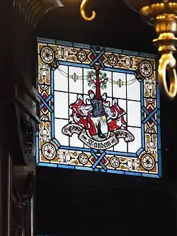 Über den Erdgeschoss-Außenfenstern sind die Wappen diverser hanseatischer Familien angebracht.
