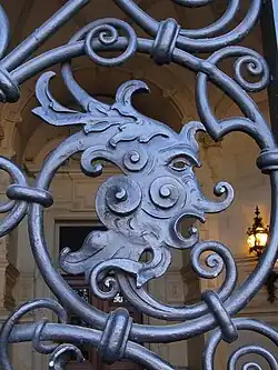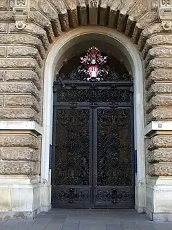 Das prächtige schwarze Eingangsportal mit üppigem Rankenwerk und verknäuelten Rosetten und Figuren ist ein Zeugnis der Kunstfertigkeit des Hamburger Kunstschmiedehandwerks.