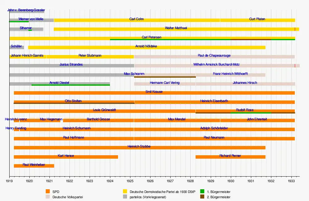 Der neue, demokratische Hamburger Senat wurde erstmals am 28. März 1919 von der Bürgerschaft gewählt, getragen von einer Koalition aus der Deutschen Demokratischen Partei und der SPD. Die SPD hielt sich als stärkste Fraktion zurück: sie stellte nicht den Ersten Bürgermeister, sondern ließ zu, dass dieser Posten im Sinne personeller Kontinuität von Senatoren übernommen wurde, die schon dem Vorkriegssenat angehört hatten. Mit der USPD wurde aufgrund eines sehr harten Wahlkampfes eine Koalition von Seiten der SPD ausgeschlossen.[1] Mit der Bürgerschaftswahl vom 26. Oktober 1924 hatte die bisherige Koalition keine Mehrheit mehr. Die Deutsche Volkspartei wurde in die Koalition mit aufgenommen und stellte ab 18. März 1925 mehrere Senatoren. Nach der Wahl vom 27. September 1931 hatte der amtierende Senat seine Mehrheit in der Bürgerschaft verloren. Da aber kein neuer Senat gewählt werden konnte, führte der alte Senat die Geschäfte weiter.
