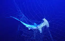 Hinzu kommen auch in Regionen, in denen die Hammerhaie nicht selbst bejagt werden, regelmäßig hohe Beifangzahlen, da die Tiere in Küstennähe in der Regel mit kommerziell sehr begehrten und stark befischten Arten vergesellschaftet sind. Aufgrund der sehr ungenauen Daten zur Hochseefischerei liegen allerdings keine konkreten Fangzahlen oder Angaben zu Populationsgrößen und -veränderungen der verschiedenen Arten vor.[14] Auch in Hainetzen, die zum Schutz von Badestränden vor allem vor den Küsten Australiens und Südafrikas gespannt werden, verfangen sich regelmäßig Hammerhaie.
