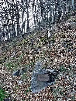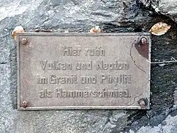 Der Leipziger Geologe Hermann Credner hatte die Gesteine im Westerzgebirge genauer untersucht und dieses besondere Naturphänomen entdeckt. Er ließ an einer von der Straße aus gut sichtbaren Stelle im Jahr 1910 die genannte Tafel anbringen. Dort informierte sie einige Jahrzehnte Vorüberkommende, bis in den späten 1990er Jahren Vandalen die Tafel entfernt hatten. Als in diesem Bereich Dreharbeiten des KabelJournals durchgeführt wurden, fand Kameramann Friedhold Hamann die Tafel am Hang im Gebüsch. Sie wurde geborgen und in Zusammenarbeit mit der Stadtverwaltung, dem Ortschronisten Lothar Walter und dem Geologen Ralf Ebert rekonstruiert. Sie wurde danach wieder an der ursprünglichen Stelle angebracht.[1]
