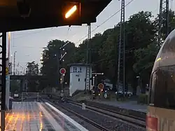 Ein ICE Richtung Frankfurt steht vor den Formsignalen auf der Südseite des Hauptbahnhofs Hanau. In der Abenddämmerung sind Nacht- und Tagzeichen zu erkennen.