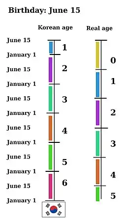Nach der traditionellen koreanischen Alterszählung (세는나이 seneun nai), umgangssprachlich auch koreanisches Alter (engl. Korean age; kor: 한국 나이 hanguk nai), ist ein Kind mit der Geburt bereits 1 Jahr alt. Darüber hinaus wird man nicht am Geburtstag um ein Jahr älter, sondern alle Menschen an Neujahr, was im „Extremfall“ dazu führt, dass ein am 31. Dezember geborenes Kind am darauffolgenden 1. Januar, also nur wenige Stunden später, bereits 2 Jahre alt ist. Es kann die simple Formel „Koreanisches Alter“ = (Aktuelles Jahr − Geburtsjahr) + 1 zur Berechnung angewandt werden. Die ostasiatischen Länder China, Japan und Vietnam wandten in der Vergangenheit das gleiche Altersbestimmungssystem an. In Nordkorea wurde es in den 1980er Jahren abgeschafft. Südkorea schaffte es 2023 ab.