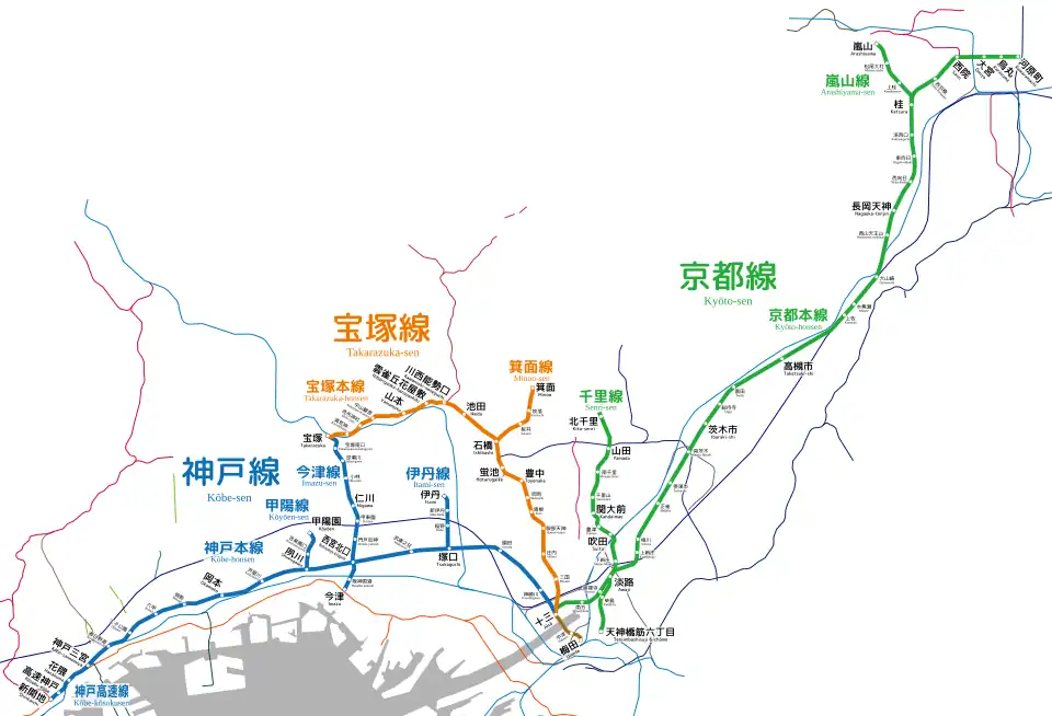 Der Unternehmensname leitet sich von Keihanshin Kyūkō (京阪神急行) ab. Das Wort Keihanshin (京阪神) bezeichnet dabei die Metropolregion, welche sich aus den Städten Kyōto (京都), Osaka (大阪) und Kōbe (神戸) bildet. Kyūkō (急行) bedeutet wörtlich übersetzt Expresszug. Der wichtigste Bahnhof des Streckennetzes liegt in Umeda, einem Stadtteil von Osaka, in welchem eine Vielzahl privater Eisenbahnstrecken zusammentreffen und Umstiege ermöglichen, zum Beispiel zum Streckennetz von Kintetsu.
