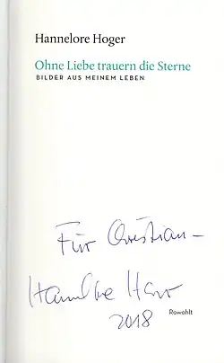 - ↑ Jörg Michael Seewald: Hannelore Hoger im Gespräch: Ich stehe auf der Erde, dies ist mein Standpunkt. In: FAZ, 2. November 2013.