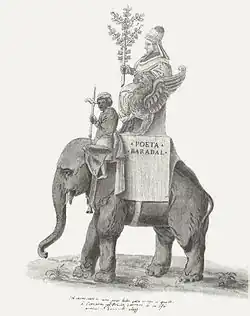 Belegt ist ein Triumphzug für den Dichter und Hofnarren Baraballo.[13] Giacomo (oder Jacopo) Baraballo, Abt von Gaeta, war eine der prominenteren Gestalten in der gemischten Gesellschaft, die den apostolischen Hof Leos bevölkerte. Seine kunstreich improvisierten, an das Vorbild Francesco Petrarcas angelehnten Verse sollen in ihrer unfreiwilligen Komik den Papst und seine Gäste regelmäßig zu Ausbrüchen größter Heiterkeit veranlasst haben, und zur allgemeinen Belustigung pflegte man ihn mit Ehrungen, für die er sehr empfänglich gewesen sein soll, zu überschütten.[14] Da er sich selbst als Petrarca ebenbürtig ansah und eigens nach Rom gekommen war, um sich zum poeta laureatus krönen zu lassen, nutzte der Papst die Gelegenheit zu einer besonderen Darbietung grausamen Humors und krönte ihn am 27. September 1514 in einem ausgesuchten Zeremoniell, das in vielen Einzelheiten überliefert ist.[15] Höhepunkt war, ihn auf Hanno herumzuführen, was der Elefant zunächst auch geduldig ertrug. Die von dem Spektakel angelockten Zuschauer machten indes einen solchen Lärm, dass der Elefant nervös wurde und den Dichterfürsten abschüttelte; das Ereignis fand seinen literarischen Niederschlag und blieb deshalb unvergesslich.[16] Spätere Quellen bezeugen, dass Baraballo, offenbar ohnehin nicht mehr im Vollbesitz seiner geistigen Kräfte, wohl kurz danach verstorben ist.[17]