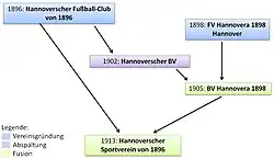 Am 3. Juli 1913 entstand der Hannoversche Sportverein von 1896 durch eine Fusion des Hannoverschen FC von 1896 mit dem BV Hannovera 1898. Letzterer entstand 1905 durch die Fusion des FV Hannovera 1898 Hannover und des 1902 vom HFC 1896 abgespaltenen Hannoverschen BV. 1902 hatten sich dem HFC 1896 bereits die Spieler von FV Germania 1902 Hannover angeschlossen. Von Anbeginn bis weit in die 1950er Jahre trug der Verein seine Spiele auf der hannoverschen Radrennbahn am Pferdeturm aus. Bei der Fusion 1913 wurden als Spieltracht schwarze Hosen und weiße Hemden beschlossen.[11] Der Verein kehrte aber dann wieder zu den roten Trikots des HFC zurück.