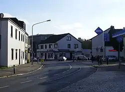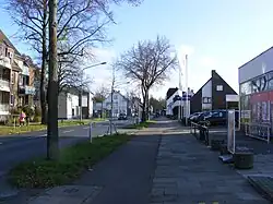 An der Straße stehen überwiegend ein- bis zweigeschossige Gebäude.
