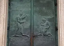 - Kirchentüren mit Darstellung der drei heiligen Johannes und des Petrus Canisius, Pfarrkirche Arzl, Innsbruck, 1947[3]