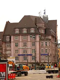 - „Riegele-Block“, ein Wahrzeichen der Augsburger Innenstadt an markanter Stelle am Königsplatz, Bürgermeister-Fischer-Straße 12, erbaut 1912–1915 im neubarocken Stil mit Jugendstilornamentik. Der Bau wurde benannt nach der ursprünglich dort befindlichen Bierhalle der Brauerei Riegele; die Innenräume sind heute verändert.