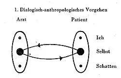 "In der anthropologischen Grundhaltung spricht der Arzt den Patienten in seinem Selbst als namentliches Du an und stellt ihn so auf die ganzheitliche Zwiesprache hin. Diese dialogische Begegnung ist in Einem sowohl Ausgangspunkt als Ziel unserer therapeutischen Bemühung. In ihr entspringt und vollzieht sich die wahre Heilung der Neurose. Das heißt: im Wagnis dieser Begegnung, in ihrem Gelingen oder Mißlingen kennzeichnet sich untrüglich der Prozeß der Heilung im positiven oder negativen Aspekt. [...] Indem wir im unmittelbaren Appell das personale Selbst des Patienten wachrufen und ihn derart in seiner Zwiesprachefähigkeit dauernd wach zu erhalten versuchen, werden zugleich die latenten Kräfte und Fähigkeiten der Seele in Anspruch genommen und in den Heilungsprozeß mehr und mehr einbezogen. In dem Maße, als sich die dialogische Beziehung zum Arzt vertieft und entfaltet, gewinnt das Selbst neuen Mut und die Kraft, sich seiner seelischen Ausdrucksorgane zu bedienen und sie im Leben mit der Welt einzusetzen." (Heilung aus der Begegnung, 1951, S. 45)