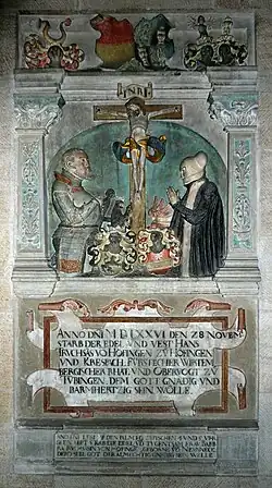 - ANNO DNI M.LXXVI DEN 28 NOVEM: STARB DER EDEL UND VEST HANS TRUCHSÄS VO(N) HÖFINGEN ZU HÖFINGEN UND KRESPACH, FÜRSTLICHER WIRTEMBERGISCHER, RHAT, UND OBERVOGT ZU TÜBINGEN. DEM GOTT GNÄDIG UND BARMHERTZIG SEIN WÖLLE.