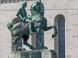 Zu Beginn des 20. Jahrhunderts entstand der Wunsch, Hans Waldmann ein Denkmal zu setzen. Mehrere Gutachten, die der Stadtrat einholte, fielen negativ aus. Laut dem Historiker Wilhelm Oechsli wird Hans Waldmann in der Bevölkerung weit poetisch-legendenhafter dargestellt, als er wirklich war und es sei fraglich, ob er ein nachahmenswertes Vorbild darstelle.[17] Der Despot sollte möglichst totgeschwiegen werden. Ohne Wettbewerb[18] wurde der Auftrag an den Bildhauer Hermann Haller vergeben und die endgültige Plastik angeblich aus der Bronze eines verschrotteten italienischen Unterseeboots hergestellt.[19] Am 6. April 1937 wurde das Reiterstandbild auf dem Münsterhof unmittelbar beim Fraumünster eingeweiht, diesen Anlass besuchten 10000 Personen.[20] Im Unterschied zu den vorangegangenen Kontroversen vermittelte diese Feier den Eindruck grösster Einigkeit, obwohl sich patriotische Kreise ein traditionelleres Standbild gewünscht hatten. Die Zunft zum Kämbel hatte das Hans-Waldmann-Denkmal gestiftet, während der Sockel und die Anpassung der Limmat von der Stadt bezahlt wurden.[18] Durch die Aufstellung des Denkmals hoffte die Zunft auf eine Rehabilitierung ihres ehemaligen Zunftmeisters,[1] der möglicherweise einem «Justizmord» zum Opfer gefallen ist.[21] An jedem Sechseläuten, bevor sie sich zum Umzug begeben, legen die Mitglieder der Zunft zum Kämbel einen Kranz in Gedenken an Waldmann nieder.[22] Für das breite Volk hat die Statue durch Propaganda in der Zeit des Nationalsozialismus eine neue Funktion erhalten.[23] Sie dient nicht mehr zur Glorifizierung einer Person, sondern der patriotischen Verehrung und somit als Symbol für den Zusammenhalt der Eidgenossenschaft.[24]
