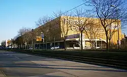 - Hansastraße 236: Am nördlichen Ende zur Ecke Malchower Weg befindet sich das „Hansa-Center“, dessen Kundschaft in der Großsiedlung Neu-Hohenschönhausen wohnt.[52] Der „Konsum-Koloss“ war um 2010 in finanzielle Schieflage geraten, zumal das nächste und größere Einkaufscenter nur eine Straßenkreuzung (430 m) entfernt steht. Mit 11.000 m² Einzelhandelsflächen und zudem für verschiedene Freizeiteinrichtungen genutzt steht der Bau mit 200 Meter Straßenfront als Hansastraße 236 adressiert. Während der Insolvenz gab es Pläne auf diesem Grundstück (16.500 m²) nach dem Abriss Wohnungsbauten zu errichten. In der Tiefe südlich von diesem Bauwerk am Malchower Weg entlang liegen Siedlungshäuser der seit (mindestens) Mitte der 1920er Jahre bestehenden Garten- und Kleinbausiedlung ‚Am Großen Seepark‘. Zwei zugehörige Straßen gingen von der Hansastraße weg, wobei Am Faulen See projektiert, aber nicht durchgehend umgesetzt wurde, der Sternberger Straße mit Fußweg fortgesetzt (später: Neuzeller Weg), die langen, schmalen Grundstücken von drei quer verlaufenden (Drossener, Königswalder, Rackwitzer Straße) erschlossen. Anfang der 1930er Jahre wurde über die Tamseler Straße erweitert, während 50 Meter Grundstücksbreite am Malchower Weg bis in die 1990er Jahre unbebaut blieben.