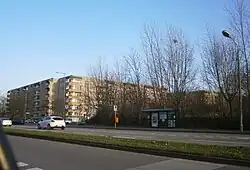 - Hansastraße 52–112 (gerade, östlich, fünf Wohnblöcke), Hansastraße 65–149 (ungerade, westlich, Wohnblöcke und Einzelhäuser), dazu am Ende der Hansastraße-Seitenast die Einzelhäuser Hansastraße 106a–106d und der kammförmige Wohnblock 108a–108f, letztere in einem Weißenseer Geländezipfel[39] zwischen Orankestrand (am Orankesee anschließend) und dem Eck Hansastraße zum Orankeweg.[40] Diese Wohnhäuser sind weitere anzumerkende Bauwerke neben denen um die Buschallee. Diese liegen auf dem Geländestreifen westlich vom Orankesee an das St. Joseph-Krankenhaus, der als landwirtschaftlich genutzter „Kirchenacker“ bis Ende der 1970er Jahre den Südrand der Kniprodeallee (in Höhe Norden des Friedhofs)[41] bildete. Die Wohnblöcke östlich der Straße entstanden noch als Typenbauten von 1988 über die politische Wende hinweg, westlich der Straße nach der Wende als „Wohnquartier Weißensee“ vermarktet stehen Wohnblöcke in freie Architekturen des sozialen Wohnungsbaus die 1994 fertiggestellt waren. Zwar ist amtlich nur ein Straßenverlauf von der östlichen Hansastraße ab am Süden des Quartiers als Hansastraße geführt, dennoch finden sich mehrere unter diesem Namen geführte Privatstraßen als Zufahrtsweg zwischen den Blöcken.