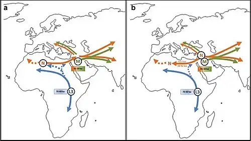 - ↑ Vicente M. Cabrera, Patricia Marrero, Khaled K. Abu-Amero, Jose M. Larruga: Carriers of mitochondrial DNA macrohaplogroup L3 basal lineages migrated back to Africa from Asia around 70,000 years ago. In: BMC Evolutionary Biology. Band 18, Nr. 1, 19. Juni 2018, ISSN 1471-2148, S. 98, doi:10.1186/s12862-018-1211-4, PMID 29921229, PMC 6009813 (freier Volltext).
