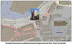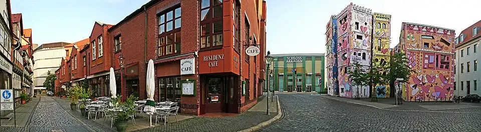 Das "Happy Rizzi House" im städtebaulichen Kontext des Magniviertels mit dem Point de vue "Horten-Bau" (Langedammstrasse) und Schlossarkaden (Ackerhof) im Jahr 2010