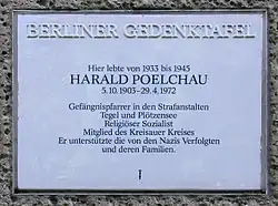 - ↑ a b c d e f Harald Poelchau (geb. 1903 - gest. 1972). In: Gedenkstätte Stille Helden. Gedenkstätte Deutscher Widerstand, archiviert vom (nicht mehr online verfügbar) am 24. Februar 2014; abgerufen am 19. Februar 2014. Info: Der Archivlink wurde automatisch eingesetzt und noch nicht geprüft. Bitte prüfe Original- und Archivlink gemäß Anleitung und entferne dann diesen Hinweis.