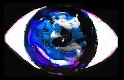Mit seiner jüngsten Serie Augenlicht von 2019/2020 knüpft Harald Puetz an die Glasbild-Projektionen der 1990er-Jahre an. Das Bemerkenswerte: Der Rezeptor für das Licht, unsere Augen, werden nun zum Rezipierten. Minutiös konzentriert auf dem Glas des Dia-Rähmchens erstellt Puetz verschiedene Farbaufträge, die zu den Rändern von schwarzer Farbe mandelförmig gefasst sind. Die Kreisform innerhalb der Ellipse lässt auf Anhieb das Abbild eines Auges erkennen, das in der Projektion selbst durchleuchtet wird. Puetz setzt kontrastreiche Farben ein, sodass sich trotz der Miniaturgröße des Glases in dem projizierten Abbild eine Tiefendimension einstellt, die im Zusammenspiel mit den leuchtenden Farben den Blick auf nahe und ferne Landschaften eröffnet.