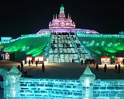 - „Ice and Snow World“ ist ein auch nachts geöffnetes Gelände, auf dem große Eisgebäude errichtet sind, die bei Dunkelheit illuminiert werden. Die bis zu einem Meter dicken Eisblöcke werden direkt dem Songhua-Fluss entnommen.