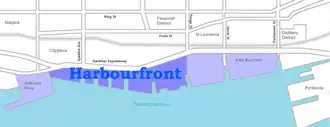 Mit Harbourfront wird der Bereich des ehemaligen Hafens von Toronto bezeichnet, der seit den 1980er Jahren mit dem Ziel umgestaltet wird, die Innenstadt an den Ontariosee heranzuführen. Bis dahin befanden sich auf dem Gebiet Bahnanlagen, Lagerflächen und Umschlagplätze und das Seeufer war nicht zugänglich. Heute ist die Harbourfront im Bezirk Old Toronto ein begehrtes Stadtviertel, überwiegend mit Wohnhochhäusern bebaut. Der umgestaltete Hafenbereich erstreckt sich rund 1,5 Kilometer in Ost-West-Richtung zwischen Gardiner Expressway bzw. Lakeshore Boulevard und Seeufer gegenüber den Toronto Islands. Es wird im Osten von der Bathurst Street begrenzt; im Westen erstreckt sich das Viertel bis zur Yonge Street. Hauptverkehrsachse war der Queen’s Quay. Er wurde 2015 zu einer Promenade mit Sitzbänken, Bäumen und breiten Geh- und Fahrradwegen umgebaut[1]. In renovierten Lagerschuppen befinden sich Restaurants und Kultureinrichtungen; die Quays wurden zu einer beliebten Promenade zusammengefasst und dienen als Marinas. In einem ehemaligen Lagerhaus befindet sich das Queen’s Quay Fähr-Terminal, von dem man zu den Toronto Islands gelangt.