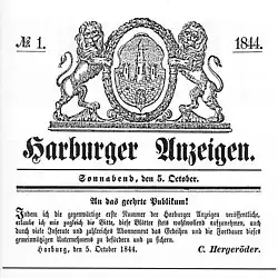Am 5. Oktober 1844 erschien unter der Obhut des Verlegers und Herausgebers Carl Hergeröder die erste Ausgabe der Harburger Anzeigen, gedruckt in Hergeröders Druckerei am Sand. Die Auflage stieg zunächst langsam auf lediglich 300 Exemplare. Erst nach Wegfall der Pressezensur 1848, die weder politische, amtliche oder unterhaltende Artikel erlaubte, konsolidierte sich die Zeitung nach Erweiterung der redaktionellen Inhalte.[3]