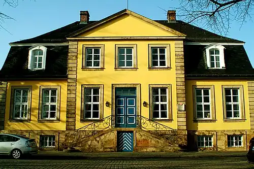 Johann Paul Heumann errichtete das palaisartige, vom französischen Klassizismus beeinflusste Gebäude als massiven, spätbarocken Putzbau[1] auf hohem Sockel und mit Gliederung durch Werksteine.[4] Der symmetrische Bau unter hohen Walm-Mansarddach wird durch einen zweigeschossigen Mittelrisalit mit doppelläufiger Freitreppe betont.[6] Im Erdgeschoss waren ursprünglich Räumlichkeiten zur Repräsentation mit Freitreppen nach allen Seiten eingerichtet. Die Privaträume waren dagegen im Mansardgeschoss eingerichtet.[1]